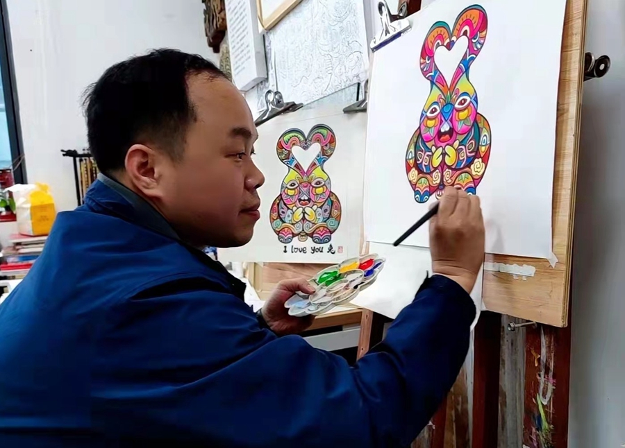 “目前,共創作了五個款式,近十個版本!辩娪懒硎,他用龍門農民畫的表現形式,融入美好寓意,畫了新穎的作品,如《I love you 兔》,一只呆萌的兔子耳朵合成“愛心”圖案,雙前腿做“比心”動作,是針對年輕人比較喜歡的、造型可愛的方面去考慮創作的,也迎合了市場審美需求。