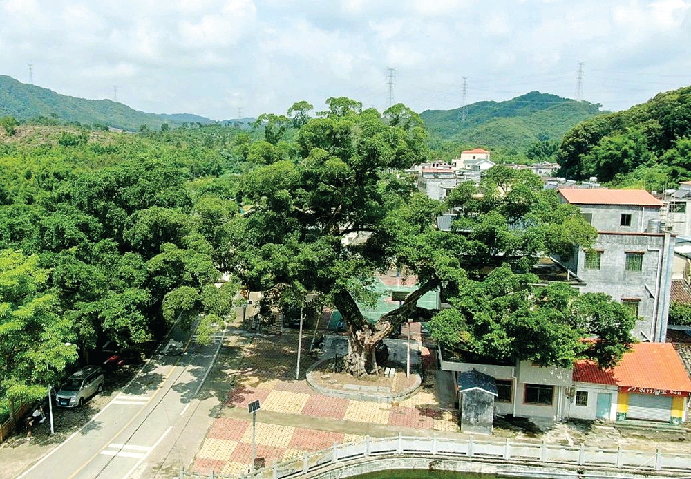 日前,記者來到距離平陵街道竹龍村數(shù)十公里外的麻榨鎮(zhèn)中心村,只見村里一棵千年古榕樹下坐著幾位老人,他們或閑聊或下棋,歲月靜好。中心村村干部張奇峰介紹,根據(jù)族譜,村子有700多年歷史,而這棵榕樹早在村落形成前就已存在。有關(guān)部門普查估測(cè),古榕樹樹齡約1015年,是惠州僅有的兩棵超千年古樹之一,另一棵為羅浮山風(fēng)景區(qū)華首古寺旁的人面子,樹齡近1300年。