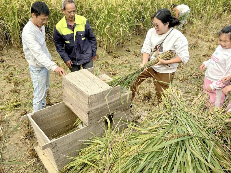 家長(zhǎng)帶著孩子到田里體驗(yàn)收割“巨型稻”。惠州日?qǐng)?bào)記者黃宇翔 通訊員龍融心 攝