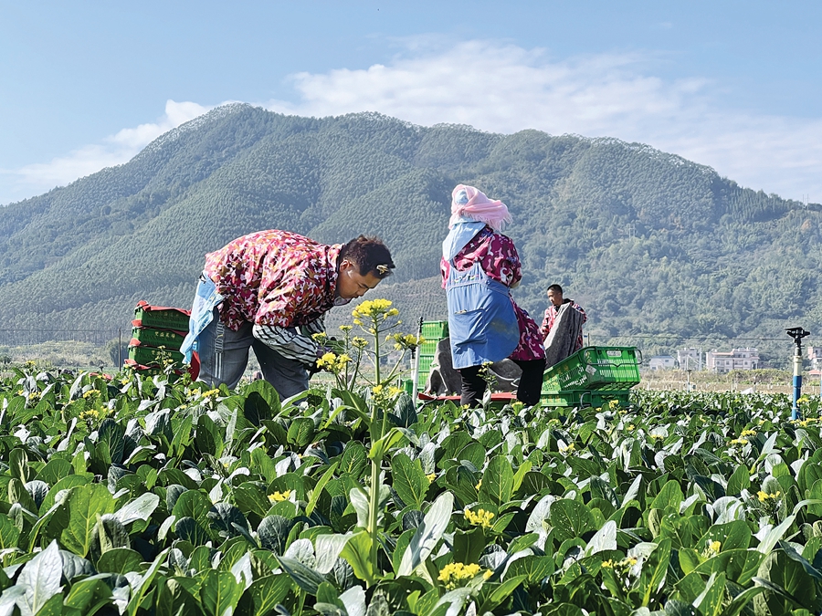 菜農忙著采摘新鮮菜心。惠州日報記者黃宇翔 攝