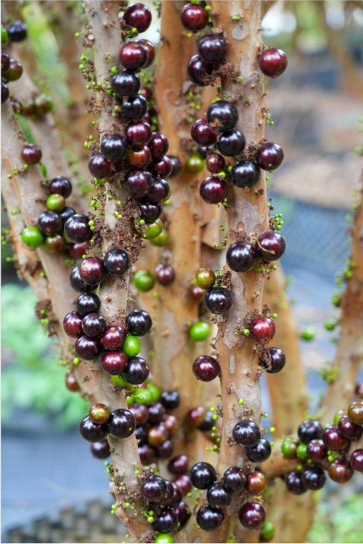 樹干上密密麻麻長滿黝黑發紫的果子,外形像極了黑葡萄,這是有著“樹葡萄”之稱的嘉寶果。