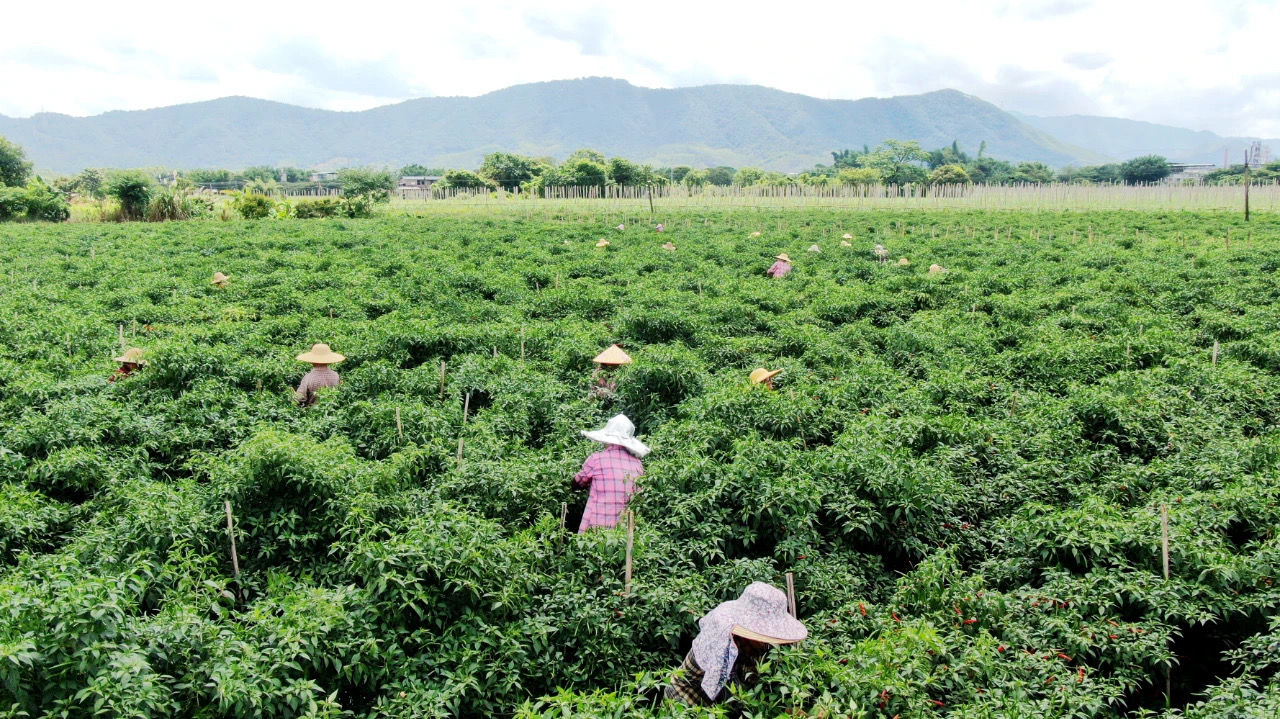 這片紅火景象的背后是“企業牽手農戶”的聯農帶農圖景。2021年,“要讓農戶敢跟著干,得先解決‘種什么、怎么種、賣給誰’三大問題。”惠州稼興農業科技發展有限公司政務總監李群志說,從最初租用100畝地到如今的700畝,該企業通過與相關辣椒研究機構合作,采取“科研院所技術供給+企業運營實施+農戶(種植戶)”三位一體協同發展模式,為反季節辣椒種植產業發展提供有力支撐。研究所的專業技術人員常年駐守種植場,傳授防旱防澇、科學施肥除蟲等技術,還深入講解與企業合作的優勢,鼓勵農戶擴大種植規模。
