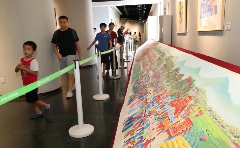 展廳內(nèi),一幅長13米、寬1米的農(nóng)民畫《非遺里的龍門》吸引市民紛紛駐足拍照,感嘆其創(chuàng)作之精妙、內(nèi)容之豐富。這幅由龍門縣文化廣電旅游體育局策劃出品,黃偉平、廖錦鋒、梁彩歡、駱雪芳、羅秀芳、劉少夏、蘇曉明7位畫家歷時半年創(chuàng)作的作品在本次展覽中首度公開展出。舞火狗、做棚、上燈、虎頭花燈、醒獅、春牛舞、舞龍、織帶仔、造紙、盒籮、釀酒、米餅、胡須雞、大籠糍、西溪筍等40多項非遺瑰寶躍然紙上,人物神態(tài)栩栩如生,四時風俗熱鬧喜慶,山川景致清新宜人,堪稱龍門農(nóng)民畫版的“清明上河圖”。