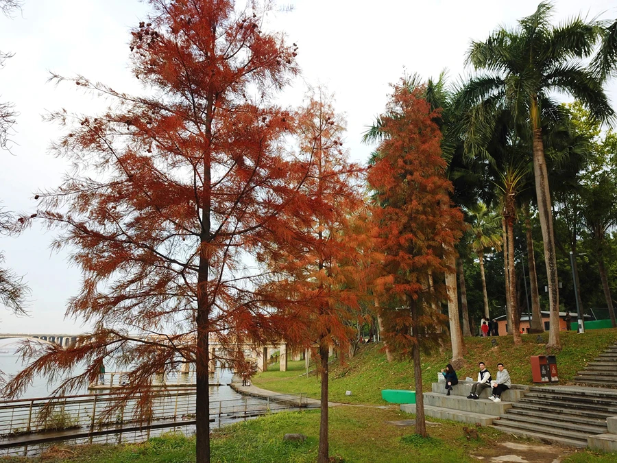 近日,市區(qū)東江沙公園一片紅杉林漸成佳境,臨江的一側(cè)居然藏著10多株艷麗的紅杉樹。遠遠地就看見江邊一抹亮紅,一棵棵紅杉樹特別顯眼,淺紅、深紅、金紅等多種顏色交織在一起,倒映在東江的湖面,成為一道獨特的風景線,恍如進入油畫世界,吸引了眾多市民來打卡拍照。