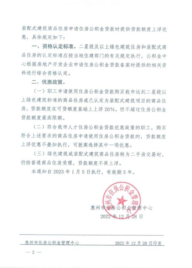 據(jù)該中心發(fā)布的《關于實施我市綠色建筑和裝配式建筑項目商品住房住房公積金貸款額度優(yōu)惠政策的通知》(下稱《通知》),自2023年1月5日起,中心針對符合惠州市公積金貸款條件的職工購買惠州市綠色建筑或裝配式建筑商品住房申請住房公積金貸款時提供貸款額度上浮優(yōu)惠。