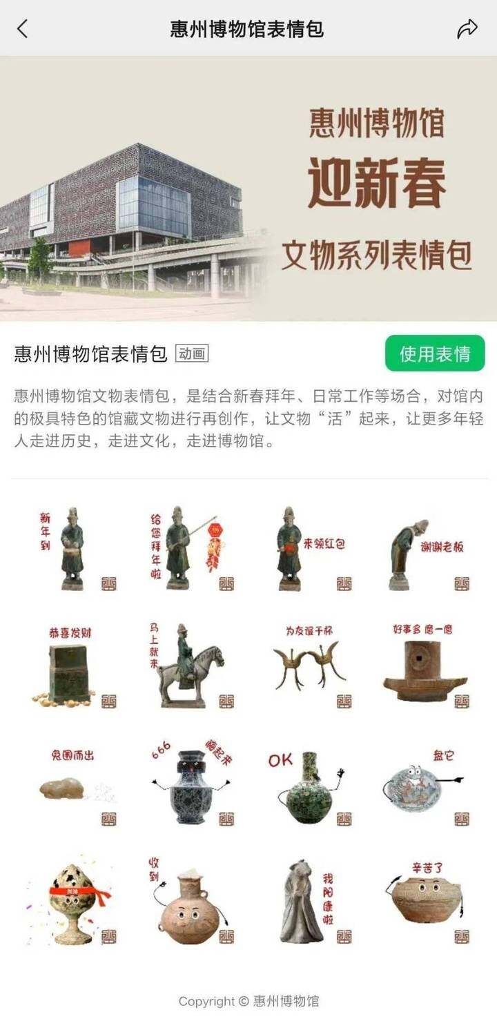 近日,惠州市博物館制作發(fā)布了首套“迎新春”文物表情包。在館藏文物精品的基礎(chǔ)上,融入現(xiàn)代大眾的生活元素,這一系列表情包可以讓年輕朋友走進(jìn)市博物館,了解惠州的歷史文化。通過微信表情商店搜索“惠州博物館”,或掃描二維碼就可以免費(fèi)下載。