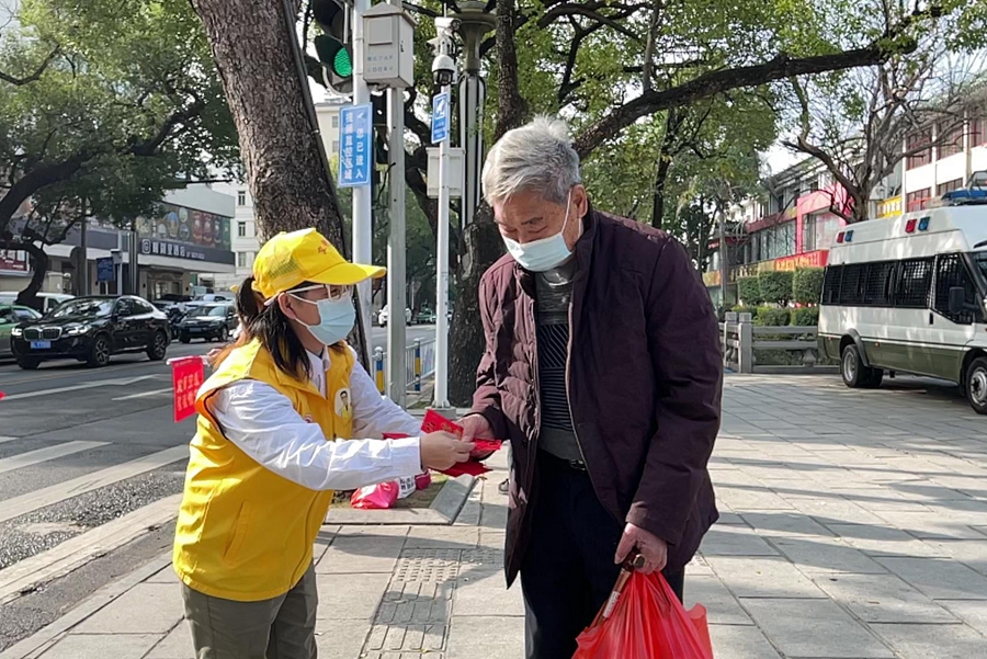 昨日,志愿者們以發“紅包”的創新方式倡導市民、游客文明出行。 惠州日報記者張藝明 攝
