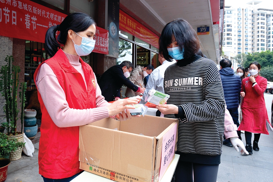 志愿者為有需求的市民發放藥品。惠州日報記者湯渝杭 攝