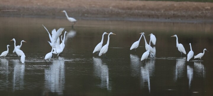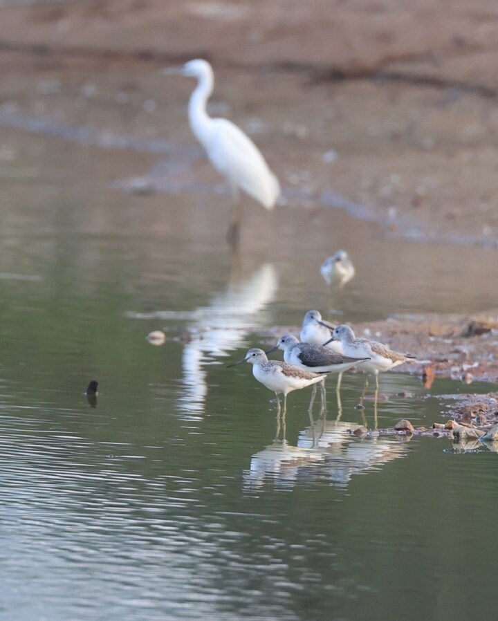 成群的長腳反嘴鷸飛過水面蔚為壯觀。