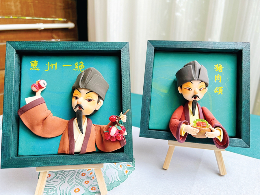 何瑞霞安安靜靜地創作,在她身后不遠處,目之所及的惠州西湖水,波光粼粼。因為家在豐湖書院附近,承載著蘇東坡詩意人生的惠州西湖給了她不少創作靈感。她想通過黏土作品展現蘇東坡平生謫居軌跡與美食的交集。她手中正在創作蘇東坡與東坡肉。最近,她已完成作品《惠州一絕》,“日啖荔枝三百顆,不辭長作嶺南人”。蘇東坡手持紅彤彤的荔枝,形態活潑可愛,手中的荔枝有的露出了“冰肌”,美味的氛圍感十足。