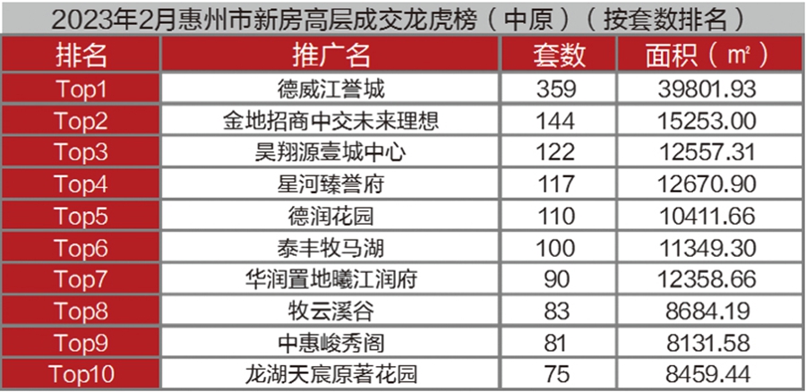 在去庫存回籠資金的訴求下,不少項(xiàng)目陸續(xù)加入“強(qiáng)促銷”政策陣營,并取得了較好的去化效果,各大樓盤紛紛在朋友圈曬出自己的“成績單”。惠州中原戰(zhàn)略研究中心發(fā)布的全市新房高層成交龍虎榜顯示,2月,共有6個樓盤成交量超過百套,其中德威江譽(yù)城以359套的網(wǎng)簽量位居榜單首位,金地招商中交未來理想及昊翔源壹城中心分別以144套及122套的成績位列第二、第三名。