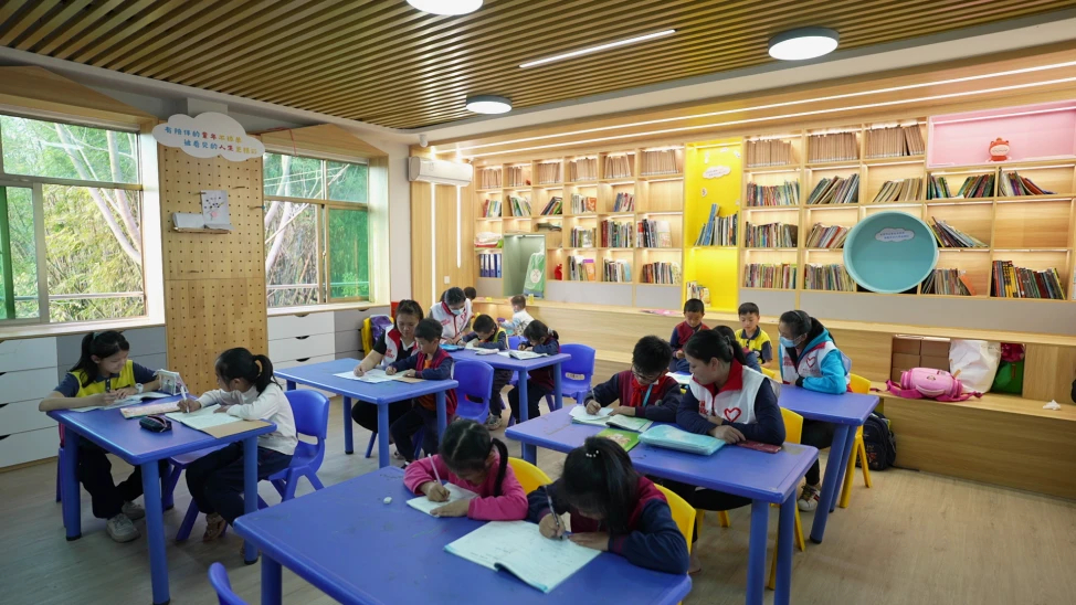 下午5時許,放學的孩子們紛紛走進村頭村兒童服務站,自覺地拿出書本,安靜地做起了作業。遇到不懂的問題,他們舉起小手,一旁的志愿者老師就上前為他們輔導。