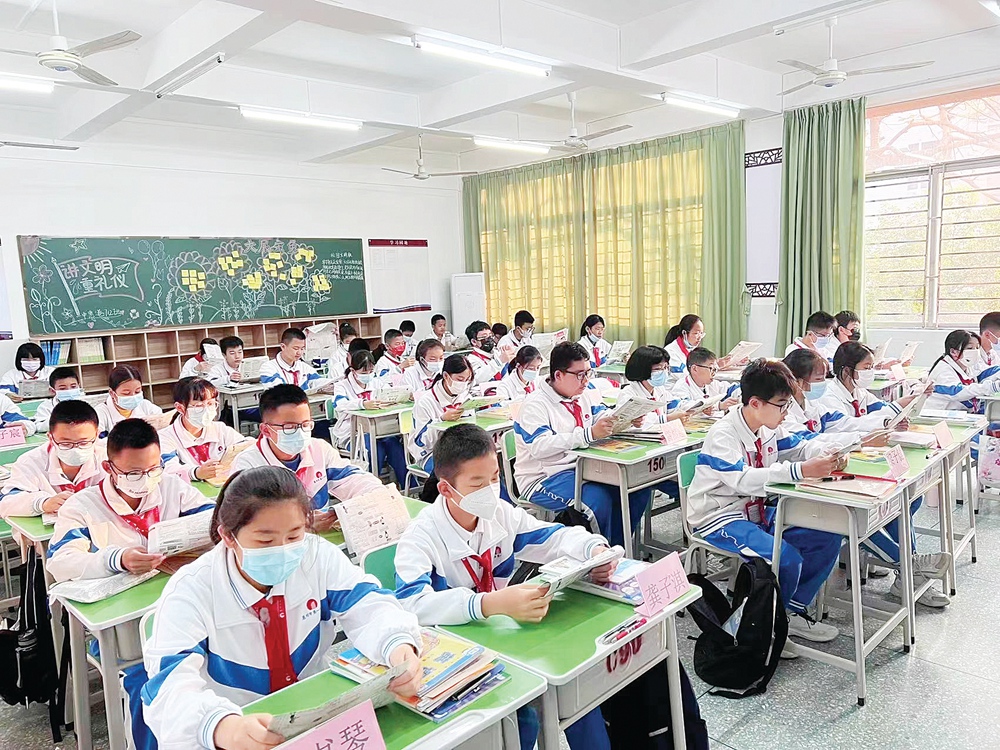 為實現潛移默化、潤物無聲的效果,學校不斷豐富學習載體,通過評選“文明班級”“三好學生”“優秀班干部”等稱號,使學生學有榜樣,做有標桿,促使學生形成良好思想品德;注重學生日常習慣的養成,以培育社會主義核心價值觀為主線,以愛國、責任、誠信、樂學、合作為主要內容,培養“文明、學習、衛生、安全、生活、體藝”六大習慣,利用紀律教育月、專題講座、每周的年級例會、每周主題班會、每周學生檢查、問題反饋等形式,及時糾正學生不良行為;通過開展“憲法晨讀”“國旗下講話”主題教育等系列主題教育實踐活動,并將偉大建黨精神和抗疫精神、科學家精神、載人航天精神及生動鮮活的實踐成就引入課堂,以提升學生的思想品德素養。