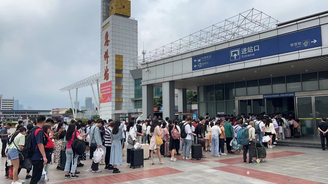 記者昨日在惠州北站進站口及候車大廳看到,返程客流明顯上升,閘機、扶梯、站臺等點位均有工作人員值守。車站根據客流情況及時加開安檢通道、人工檢票通道,旅客根據現場工作人員指引,自覺排隊進閘及上下車。