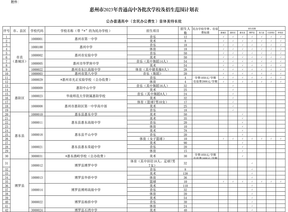 今年除個別學校外,全市民辦普通高中公辦生和民辦收費生繼續面向全市招生。同時,為進一步推動普通高中特色多樣化發展,各普通高中學校特長生計劃招生2309人,其中市直普通高中特長生全部面向全市招生。縣(區)公辦普通高中特長生招生方面,除了惠東平山中學(女子籃球)、博羅華僑中學(籃球)、龍門中學(體育足球)、仲愷中學(體育足球)4個項目外,其他縣(區)公辦高中特長生均在屬地招生。