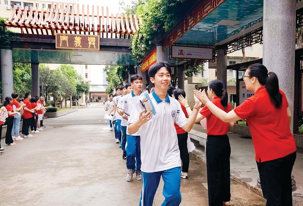 惠州市綜合高級中學(xué)的考生們在考前互相鼓勵,合影留念。學(xué)校也為考生們舉行了暖心十足、激情澎湃的送考儀式。在手拿“考神附體、勢不可擋”祝福標(biāo)語的老師的帶領(lǐng)下,考生們排隊步入考場,道路兩旁迎接他們的是身穿紅色旗袍、紅色衣服“喜慶穿搭”的教師送考隊伍。