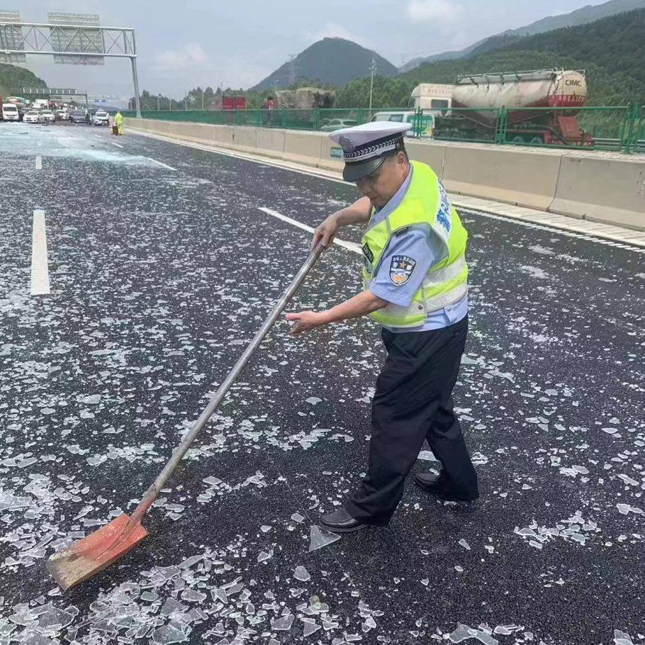不久后,養(yǎng)護部門、拯救車輛陸續(xù)到達,民警協(xié)同施救人員一起對現(xiàn)場進行清理,冒著烈日高溫,利用鐵鏟、掃把等工具第一時間清理出一條安全車道供車輛行駛。繼續(xù)不停歇地打掃2小時后,路面上所有的碎玻璃及其他障礙物最終被徹底清理干凈,道路也恢復(fù)了正常通車。