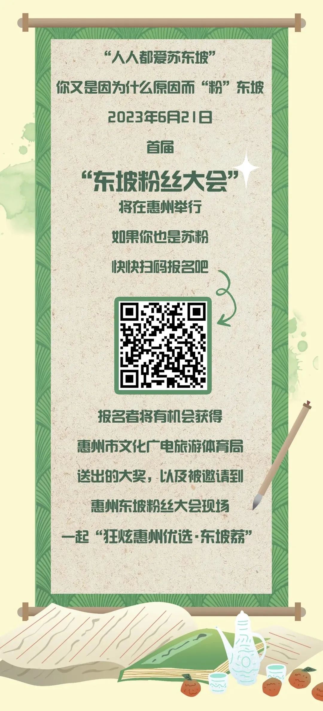惠州日?qǐng)?bào)訊 (記者龔妍)和北宋文豪蘇東坡來一場穿越千年的“約惠”。6月20~24日,首屆東坡粉絲大會(huì)暨2023惠州東坡文化旅游周活動(dòng)將在惠州舉行。日前,活動(dòng)主辦方通過南方都市報(bào)在線發(fā)布東坡粉絲召集令、尋找“最東坡”形象代言人。活動(dòng)受到全國各地“東坡粉”的熱烈追捧,數(shù)百名“東坡粉”響應(yīng)號(hào)召,近百名網(wǎng)友參加“最東坡”形象代言人選拔活動(dòng)。接下來,主辦方將結(jié)合報(bào)名者的朋友圈點(diǎn)贊數(shù)量、專家評(píng)審意見等因素,邀請(qǐng)7名東坡粉絲代表前來惠州參加6月21日在惠州文化藝術(shù)中心舉辦的粉絲大會(huì),品東坡荔枝、游東坡游線。同時(shí),“最東坡”形象代言人也將由惠州日?qǐng)?bào)社組織實(shí)地選拔,通過現(xiàn)場自我介紹、儀表展示、才藝展示、素質(zhì)展示四個(gè)環(huán)節(jié),權(quán)威認(rèn)證出“最東坡”形象代言人,邀請(qǐng)其參加粉絲大會(huì)并頒發(fā)榮譽(yù)證書。