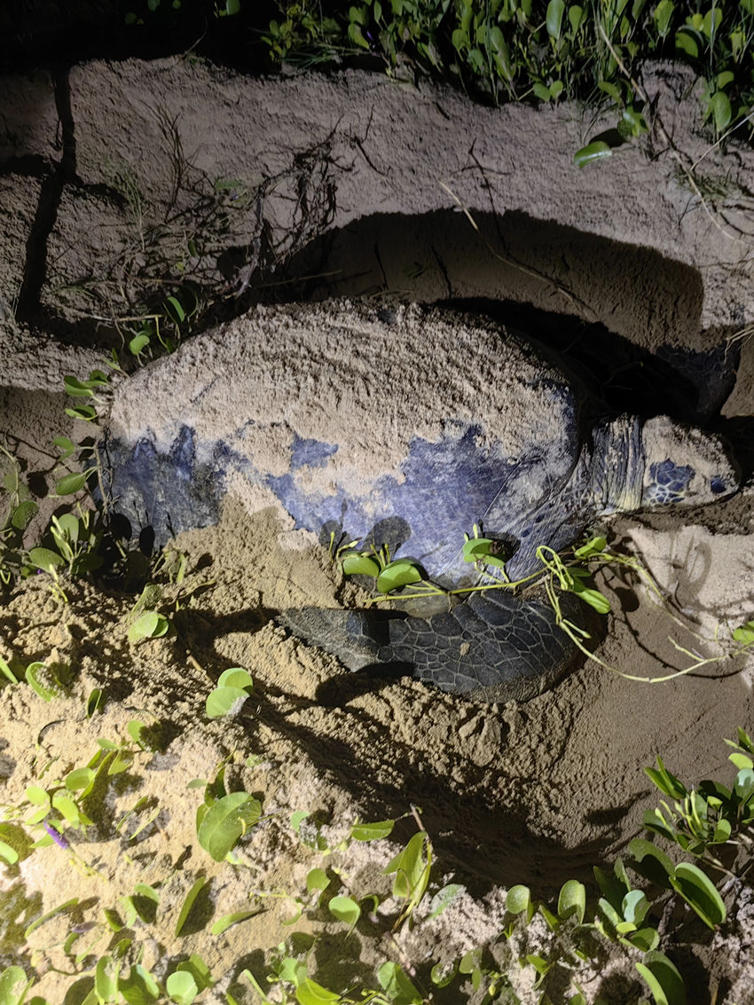 當(dāng)天凌晨,母海龜從海里悄悄爬上沙灘,用健壯的四肢在沙灘上挖了個(gè)坑,趴著產(chǎn)下一窩龜?shù)昂螅智那耐@锱廊ィ?時(shí)30分消失在浪潮里。