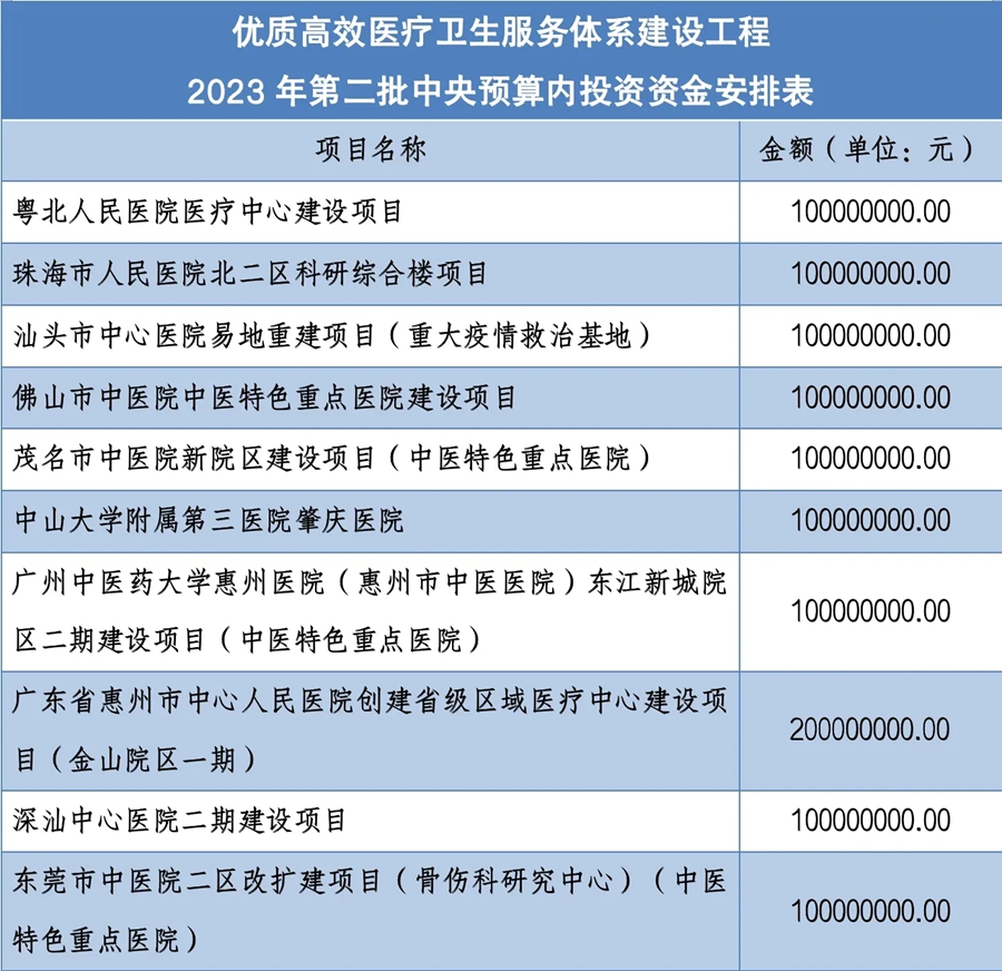 近日,廣東省財政廳轉下達財政部和省發改委相關通知,廣東10個醫院建設項目被列入國家優質高效醫療衛生服務體系建設工程2023年第二批中央預算內投資計劃,共計獲得項目支持資金11億元。其中,惠州市中心人民醫院創建省級區域醫療中心建設項目(金山院區一期)、廣州中醫藥大學惠州醫院(惠州市中醫醫院)東江新城院區二期建設項目(中醫特色重點醫院)名列其中。