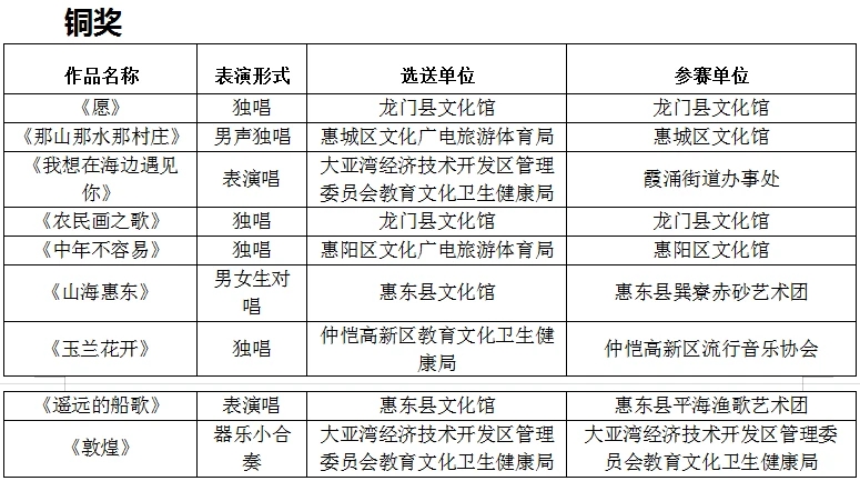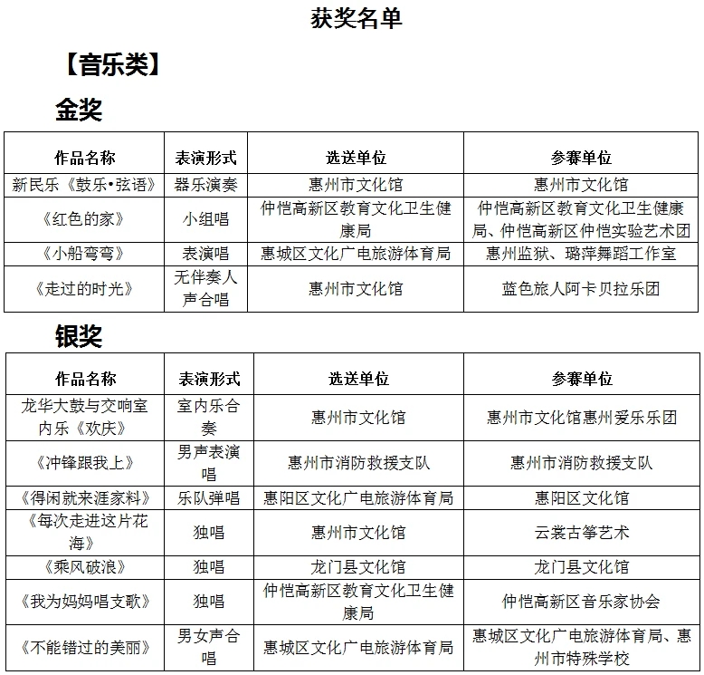 經專家評委評審,評選出音樂類金獎4件、銀獎7件、銅獎9件,舞蹈類金獎3件(其中兩件作品并列第二)、銀獎3件、銅獎4件。同時,根據各縣區近三年的音樂、舞蹈工作開展情況,以及本次群眾藝術花會的組織情況和獲獎情況,惠城區文化廣電旅游體育局和龍門縣文化廣電旅游體育局獲得優秀組織獎。