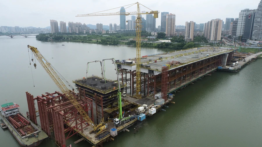鵝城大橋位于惠州市惠城區,主線全長2974米,按雙向6車道設計。目前,主橋樁基、承臺已完工,江北側鋼梁架設已完成,5個墩身已完成4個,主橋下部結構施工已接近尾聲,江東側和江中心合攏段鋼梁架設施工正有序進行。