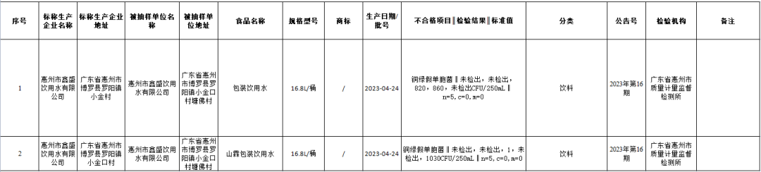 惠州市鑫盛飲用水有限公司生產的山霖包裝飲用水,銅綠假單胞菌不符合食品安全國家標準規定。檢驗機構為廣東省惠州市質量計量監督檢測所。