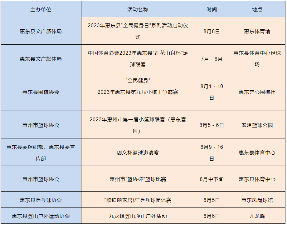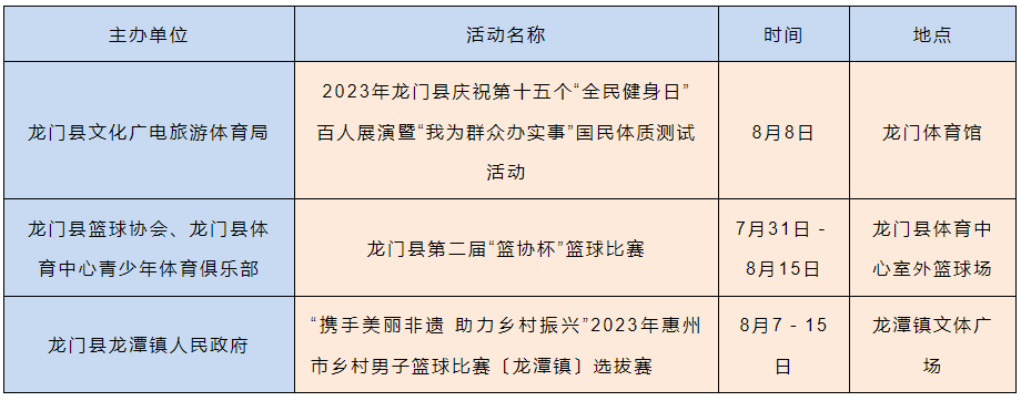 2023年8月8日是我國第15個“全民健身日”,8月8日所在周(8月7日至13日)是我國第一個“體育宣傳周”。記者從市文廣旅體局獲悉,8月8日前后,我市將以“全民健身 繪就幸福生活”為主題舉辦一系列體育賽事活動。整個8月,將會有100多高品質(zhì)體育賽事活動輪番上演,賽事內(nèi)容涵蓋了足球、籃球、登山、徒步、自行車等廣大市民喜聞樂見、踴躍參與的項(xiàng)目。同時,我市還將開展撿跑公益志愿服務(wù)和科學(xué)健身指導(dǎo)活動,用豐富多彩的健身展演、健身服務(wù)和賽事活動把健康、快樂送進(jìn)千家萬戶,讓惠州市民充分感受到全民健身的濃厚氛圍。