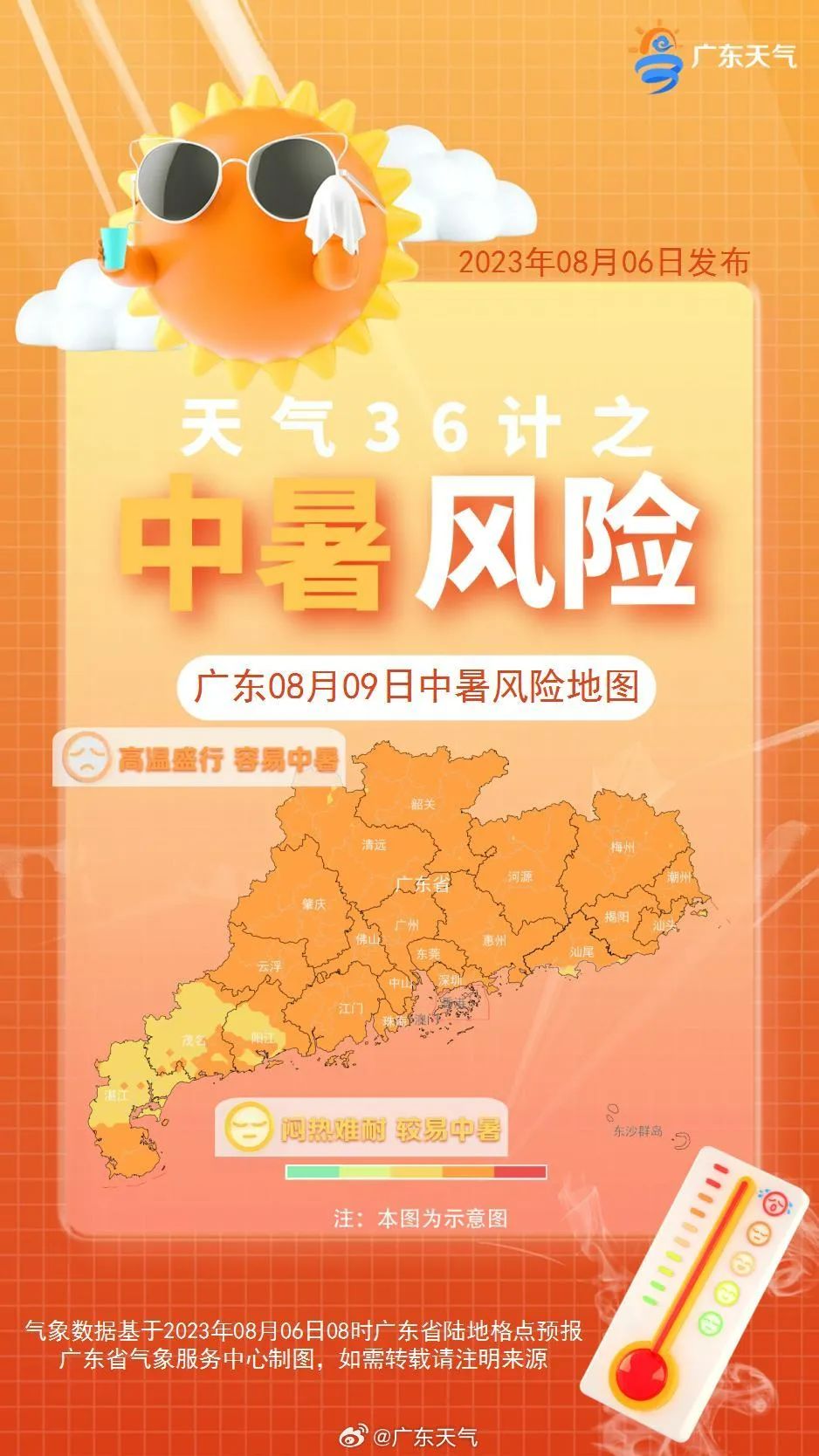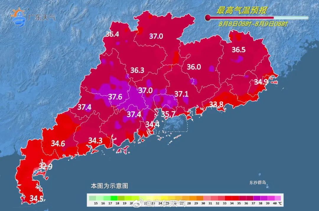 預計8月7日,西部沿海地區雷雨相對頻繁,而粵北、珠三角中北部、粵東最高氣溫可達35℃~36℃,局部37℃;8-9日,副熱帶高壓加強控制廣東,粵北、珠江三角洲和粵東市縣最高氣溫35℃~37℃。