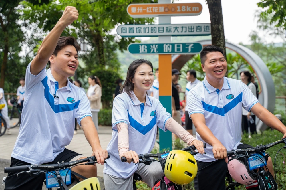 參加活動的人員在《追光的日子》紅花湖綠道打卡點開展拍攝、撿跑及騎行活動。惠州日報記者譚琳 攝