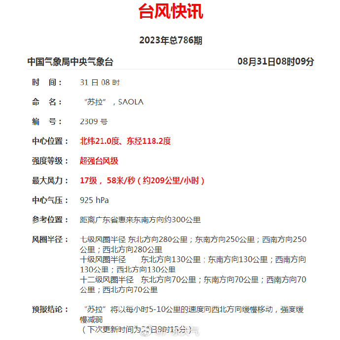 8月31日7時,今年第9號臺風“蘇拉”中心位于我市惠東港口東南方向約400公里,中心最大風力17級以上(58米/秒,超強臺風級)。預計,“蘇拉”將以10公里左右的時速向西北方向移動,將于9月1日白天在廣東中東部沿海登陸或在近岸海面向西偏南方向移動,并給我市帶來嚴重風雨影響。根據《惠州市防汛防旱防風防凍應急預案》和省防總有關規定,市三防指揮部決定于8月31日9時將防風Ⅲ級應急響應提升為防風II級應急響應