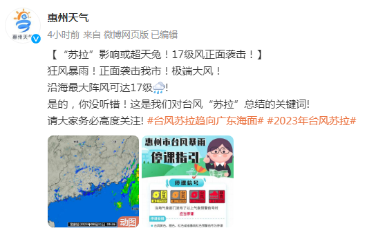 受今年第9號臺風“蘇拉”影響,為確保市民、游客的游覽安全,根據我市防臺風工作研判部署會議及上級主管部門要求,惠城區所有景區景點將于8月31日下午5時臨時關閉。待臺風預警信號以及景區安全隱患解除后再開放景區。具體開放時間另行通知。