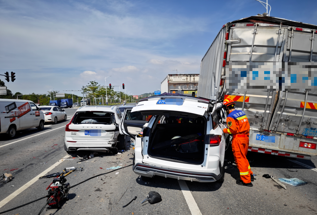 現(xiàn)場(chǎng)消防救援人員發(fā)現(xiàn)轎車副駕駛室嚴(yán)重變形,被困人員腿部被緊緊卡死在車內(nèi),并受傷出血。消防救援人員立即利用液壓破拆工具對(duì)車頭的駕駛室進(jìn)行破拆,并調(diào)派大型吊機(jī)趕往現(xiàn)場(chǎng)進(jìn)行救援。