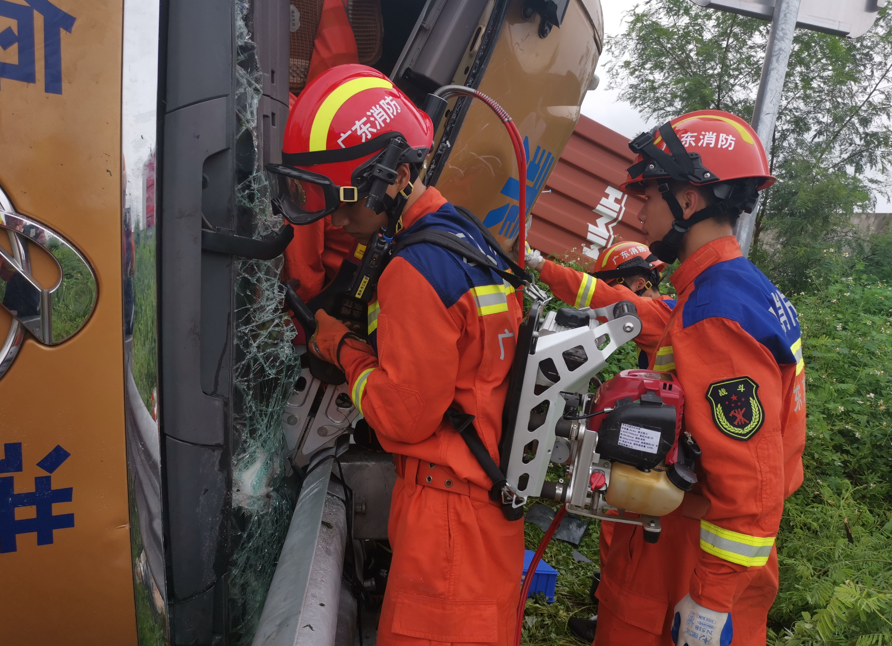 消防員立即用液壓剪切鉗對(duì)駕駛室進(jìn)行破拆將一名被困人救出。并派一名隊(duì)員到副駕駛對(duì)另一名被困人員進(jìn)行安撫。同時(shí)聯(lián)系吊車起吊車頭,中途再通過液壓破拆工具組給貨車破拆。經(jīng)過近一個(gè)半小時(shí)的緊急救援,兩名被困人員被救出。