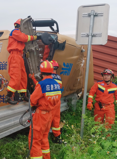 現(xiàn)場(chǎng)消防員發(fā)現(xiàn)一輛貨車在匯入高速主路轉(zhuǎn)彎口處側(cè)翻,貨車車頭變形,造成司機(jī)下肢被卡住無法脫身。