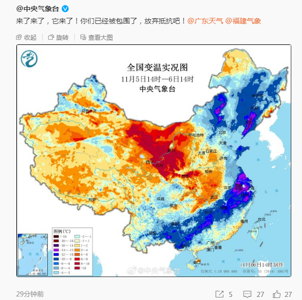 近日,一股實力強勁的冷空氣將接力南下,我國多地上演換季式、蹦極式降溫。