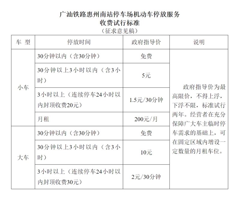 擬定惠州南站停車收費試行標(biāo)準(zhǔn)
