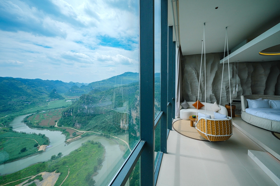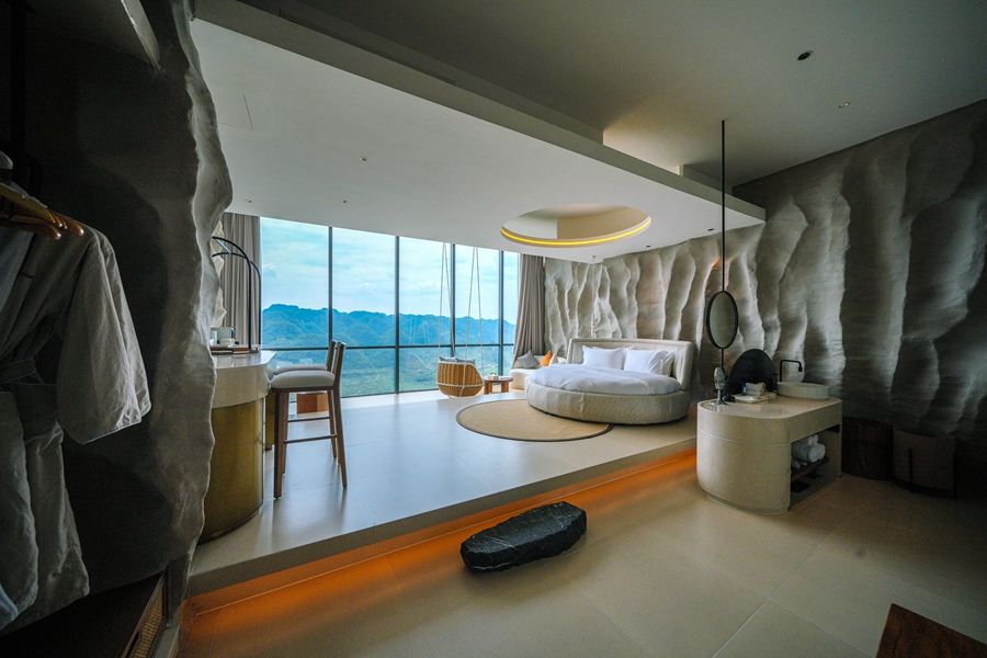 為解決“如何讓游客留得下來”的問題,安龍縣世紀投資文旅發展有限公司首先將溶巖美術館改造成為獨具特色的懸崖酒店。該公司執行董事吳斌介紹,美術館的內部被改造成11間客房+一個公共活動空間,房間以溶巖秘境風格裝修,走進去仿佛穿越到史前。透過房間的落地窗,眺望峰林、峭壁、山谷、河流等喀斯特地貌景觀,更可感受與自然融為一體的喜悅與神奇。酒店屋頂被打造為觀景臺,一旁還配了無邊際泳池,徜徉其中,看云卷云舒,觀浩瀚星空,自在山水間。