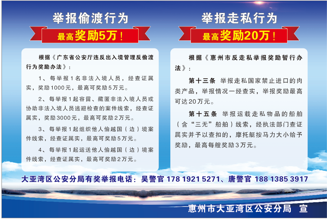 下一步,大亞灣區公安分局將持續推進反走私反偷渡宣傳活動,進一步擴大反走私反偷渡宣傳活動覆蓋面,營造濃厚的社會氛圍,并廣泛發動社會力量積極參與到反走私反偷渡綜合治理工作當中,全方位凝聚起“打擊走私、偷渡,人人有責”的社會共識。