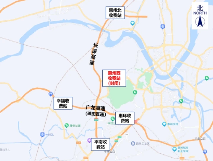 期間,建議長深高速往返惠州的車輛,請選擇就近的惠州北收費站或平南收費站上下高速;或經珠田互通轉廣龍高速,從幸福收費站或惠環收費站上下高速。