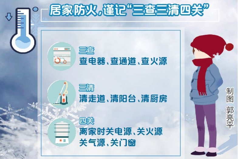 惠州市消防救援支隊有關負責人提醒,注意做好居家防火,做到“三查三清四關”,即查電器、通道、火源,清走道、陽臺、廚房,離家時關電源、火源、氣源、門窗。特別要注意的是,冬季取暖要注意安全用火用電,切勿在電暖器上烘烤衣物,電暖器與可燃物要保持安全距離,出門時關閉電源開關。同時,應購買合格的電熱毯,電熱毯嚴禁長時間通電,嚴禁在電熱毯上覆蓋過厚的被蓋,嚴禁反復折疊電熱毯。“液化氣灶平時要注意保養,在使用燃氣時要注意經常檢查爐灶、閥門、管道等是否存在泄漏的情況,一旦發生破損漏氣要及時維修。”