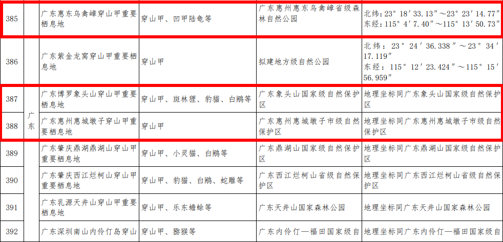 為加強陸生野生動物種群及其棲息地保護,12月20日,國家林草局發布了首批789處陸生野生動物重要棲息地名錄(下稱“名錄”)。其中,惠州共有3地入選。分別是廣東惠東烏禽嶂穿山甲重要棲息地、廣東博羅象頭山穿山甲重要棲息地、廣東惠州惠城墩子穿山甲重要棲息地。
