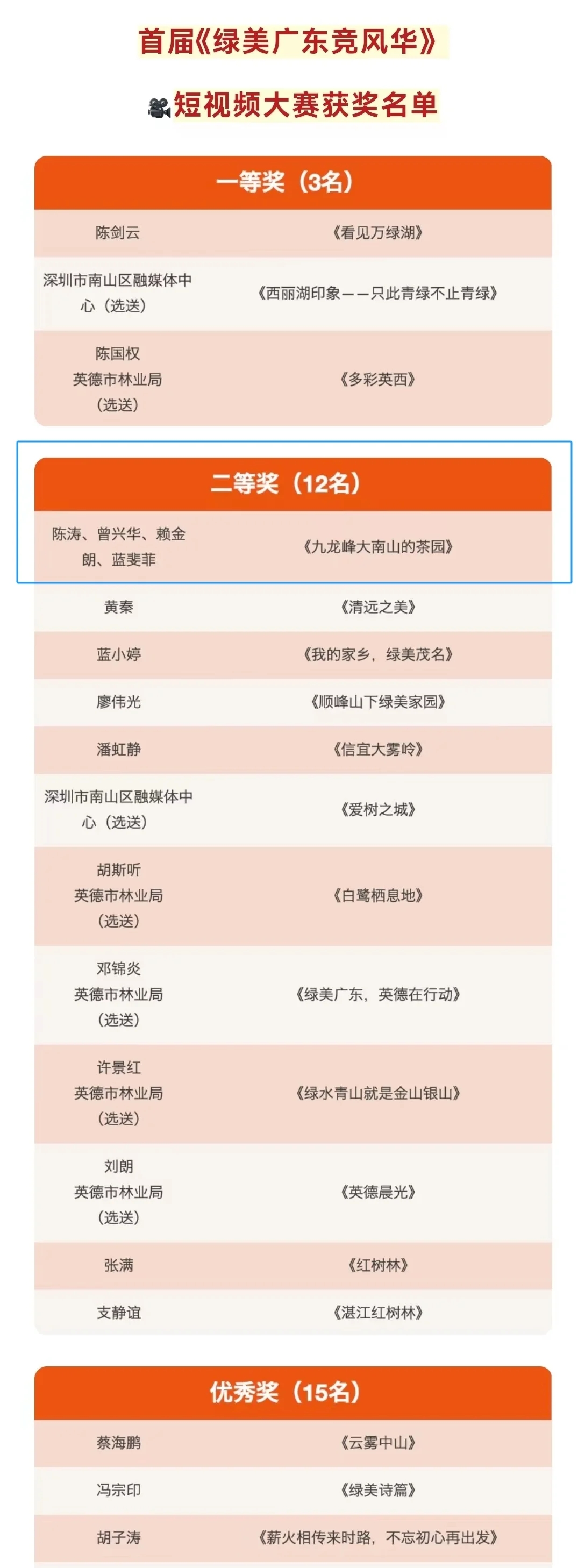 活動當(dāng)天,公布了“綠美廣東競風(fēng)華”榮譽榜單和“綠美廣東競風(fēng)華”攝影大賽和短視頻大賽等獎項。惠城區(qū)榮獲優(yōu)秀宣傳獎,由惠州日報社記者陳濤等選送的短視頻作品《九龍峰大南山的茶園》,在眾多作品中脫穎而出,榮獲“綠美廣東競風(fēng)華”短視頻大賽二等獎。