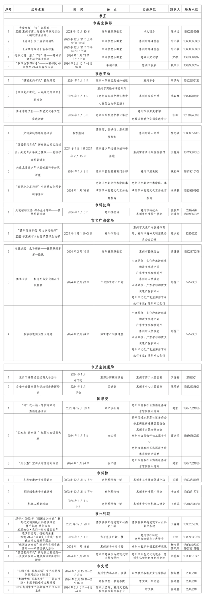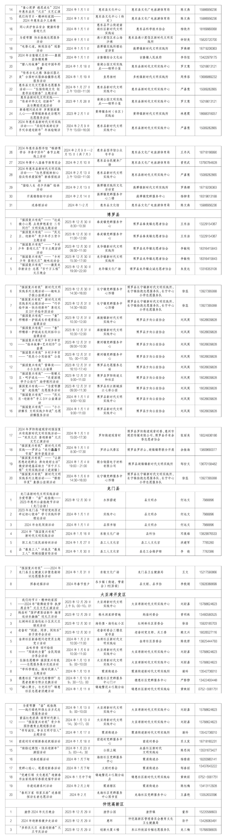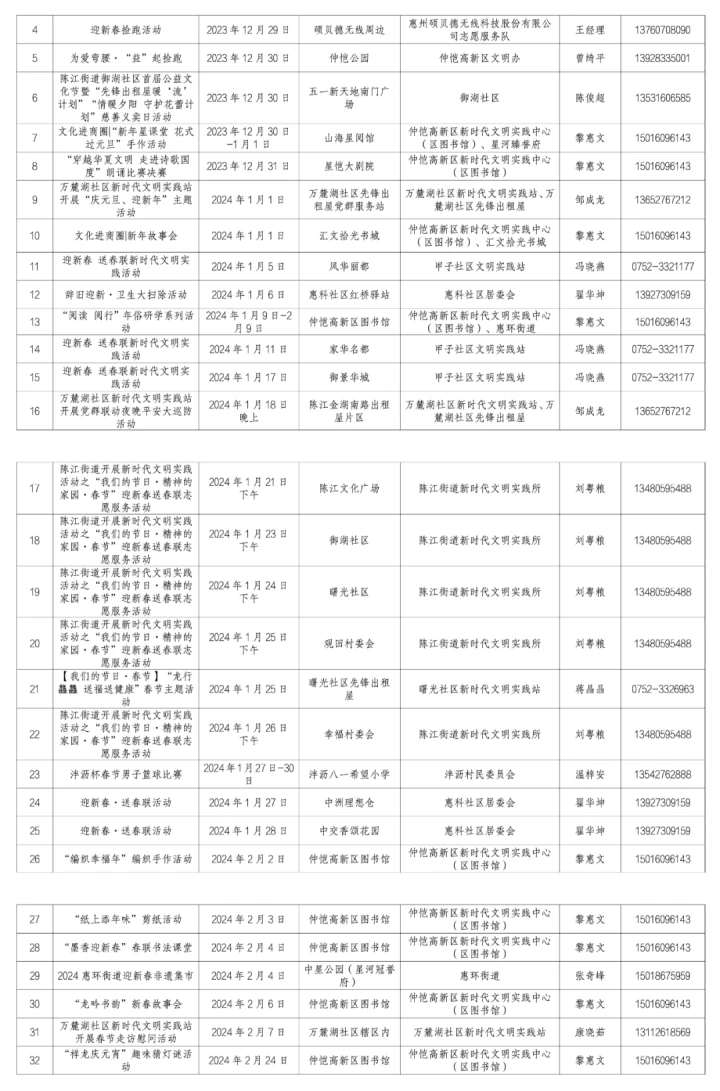 我們的節日·精神的家園、強國復興有我、愛國主義教育、節日送溫暖、公益撿跑、文化藝術、體育運動、勞動實踐等重點突出、內容豐富、形式新穎、群眾喜聞樂見的各項活動精彩紛呈,喜慶熱鬧的新年氣息撲面而來。本系列活動深入貫徹落實中央、省市推進精神文明建設高質量發展的決策部署,進一步推進常態化開展新時代文明實踐活動工作,豐富惠州元旦春節期間文化生活。