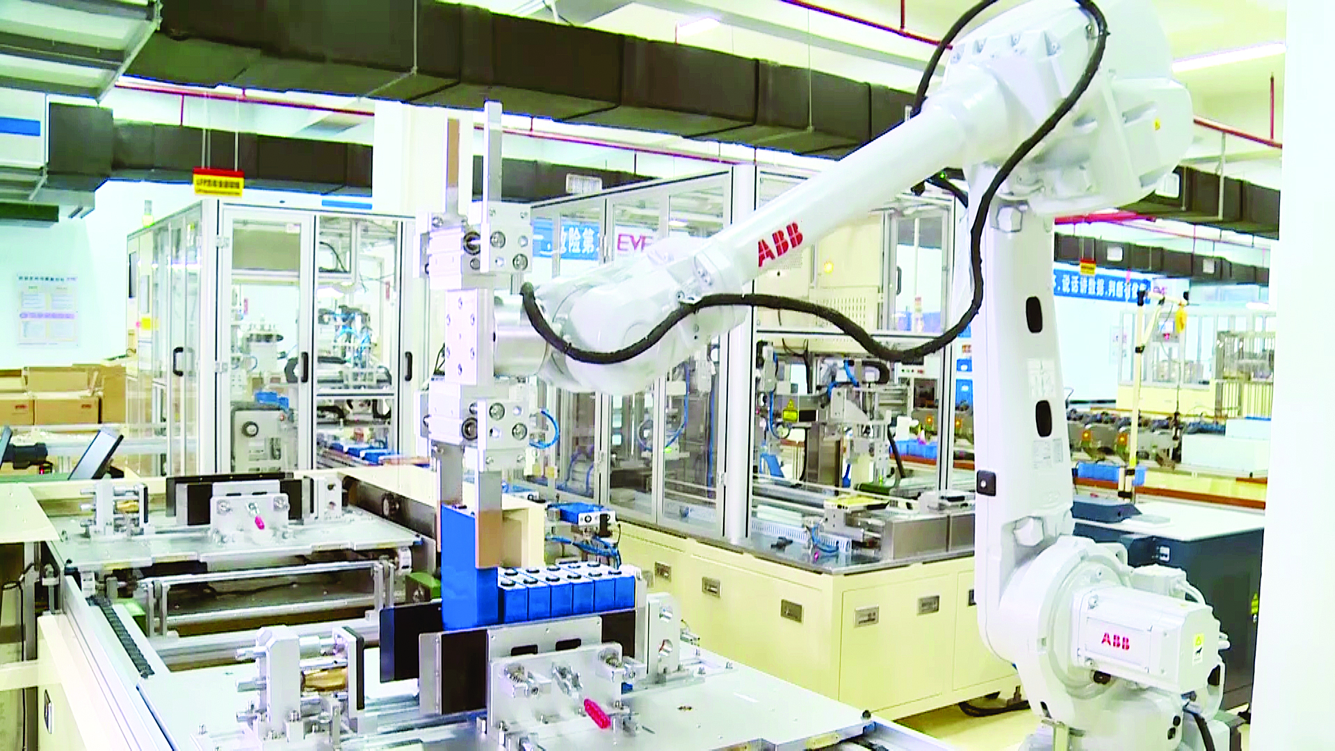 億緯鋰能方形鐵鋰電池模組自動化生產(chǎn)車間。