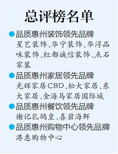 據了解,惠州總評榜作為惠州日報社為助推商業、家居行業發展舉辦的一大盛事,評選活動已持續開展10多屆。一直以來,總評榜始終堅持以服務消費者為宗旨,站在消費者立場,用消費者的眼光選出值得信賴的企業,備受消費者和業內人士認可。