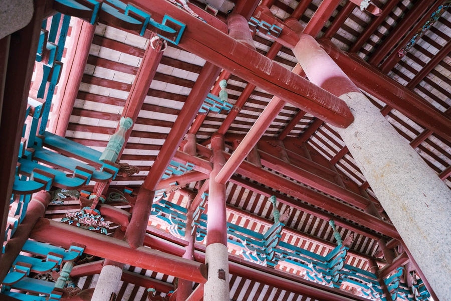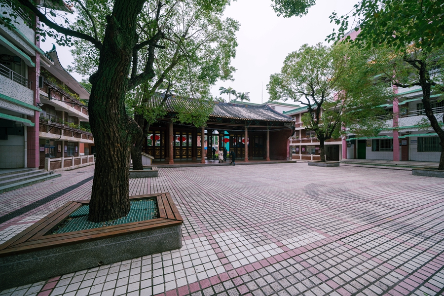 歸善學宮為灰瓦面、藍斗拱、紅殿柱、黃板瓦,整體色彩協調。