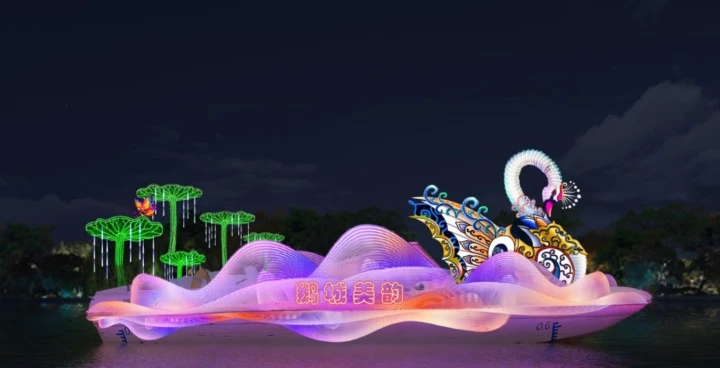 相宜居廣場準提寺碼頭的大榕樹上掛著上百只天鵝,《夢起鵝城》在夜空中閃閃發光,歡迎游客來惠州西湖觀光游玩。