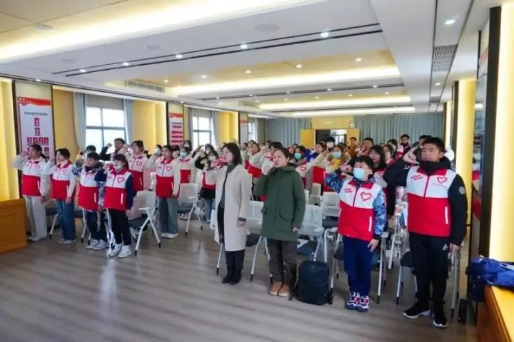 “我承諾:盡己所能,不計報酬,幫助他人,服務社會......”在楊芯蕾志愿者的帶領下,營員們緊握右拳,進行志愿者宣誓。
