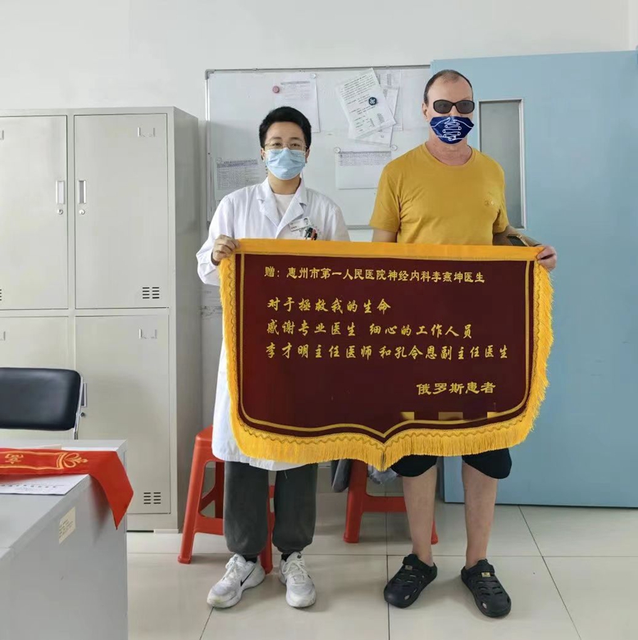 “謝謝你們救了我的命!”近日,一位來自俄羅斯的中年男子特地帶著錦旗來到惠州市第一人民醫(yī)院(以下簡稱“市一院”)神經(jīng)內(nèi)科,感謝他們兩次挽救了他的生命。